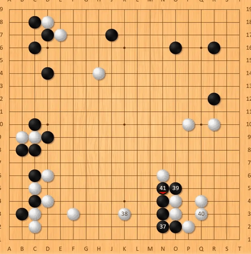 序盘布局阶段,黑棋便陷入被动,中下35、37手的扳粘决策脱离实战,导致右下外势被白棋合围,胜率瞬间下滑。